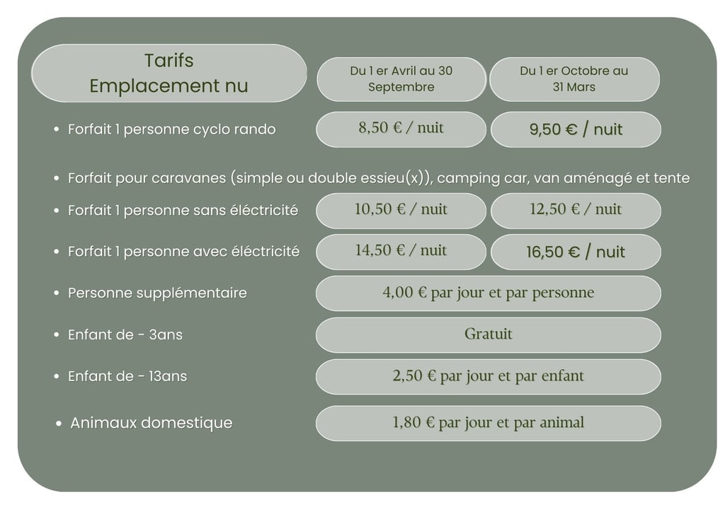 Nos emplacements spacieux et ombragés, adaptés aux tentes, caravanes et camping-cars, sont conçus pour répondre aux besoins de tous.